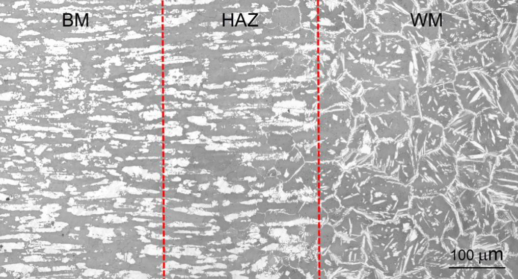 焊接過程是一個快速加熱與快速冷卻的熱循環(huán)過程。焊接接頭的組織可以分為三個部分:熔合區(qū)、熱影響區(qū)和母材。雙相不銹鋼的熔合區(qū)為鑄態(tài)組織,屬于鐵素體凝固模式,一次凝固相為單相鐵素體。焊接接頭的熱影響區(qū)根據(jù)距離焊縫熔池距離不同可分為高溫熱影響區(qū)和中低溫熱影響區(qū)。高溫熱影響區(qū)幾乎為單相鐵素體組織,高溫熱影響區(qū)的兩相比例一方面取決于鋼的化學成分,另一方面取決于焊接熱輸入、冷卻速度度等因素。中低溫熱影響區(qū)基本上處于兩相平衡區(qū),在冷速較慢的情況下,可能會產生金屬間析出相。熱影響區(qū)晶粗大且易于產生析出相,大大降低了材料的沖擊性能和點蝕性能。