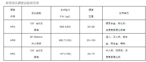 洛氏硬度試驗(yàn)采用三種試驗(yàn)力,三種壓頭,它們共有9種組合,對(duì)應(yīng)于洛氏硬度的9個(gè)標(biāo)尺。這9個(gè)標(biāo)尺的應(yīng)用涵蓋了幾乎所有常用的金屬材料。常用的有HRA、HRB和HRC三種。