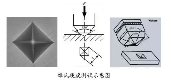 維氏硬度測量原理與布氏硬度相似。采用相對(duì)面夾角為136°金剛石正四棱錐壓頭,以規(guī)定的試驗(yàn)力F壓入材料的表面,保持規(guī)定時(shí)間后卸除試驗(yàn)力,用正四棱錐壓痕單位表面積上所受的平均壓力表示硬度值,標(biāo)記符號(hào)為HV。