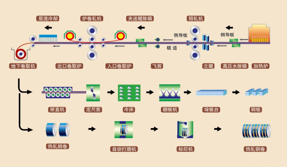 ![]() | 軋鋼分廠主要有步進式加熱爐,立輥軋機和四輥可逆式軋機等設(shè)備,可實現(xiàn)厚度3-16mm,寬度800-1600的卷軋制,最厚100mm,寬度1600mm中厚板的軋制。 |