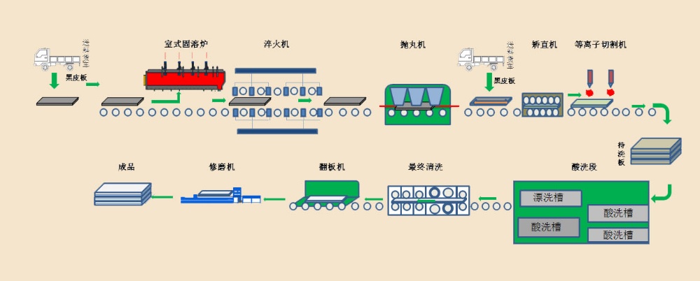 ![]() | 退火酸洗中板線主要有室式固熔爐,全自動中板淬火機組,拋丸機,矯直機,酸洗池等設(shè)備,可實現(xiàn)最寬3200mm,最厚90mm中板的退火酸洗。 |